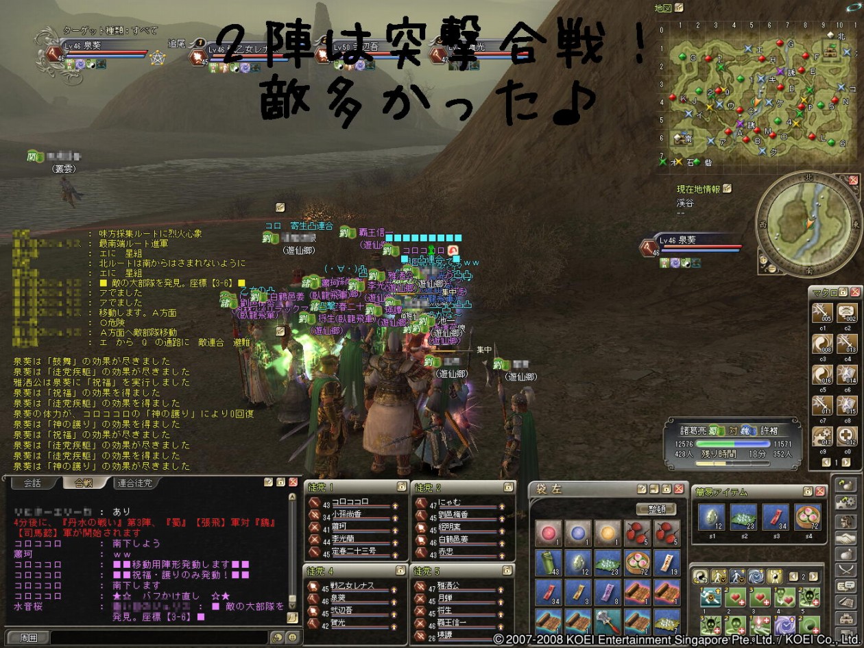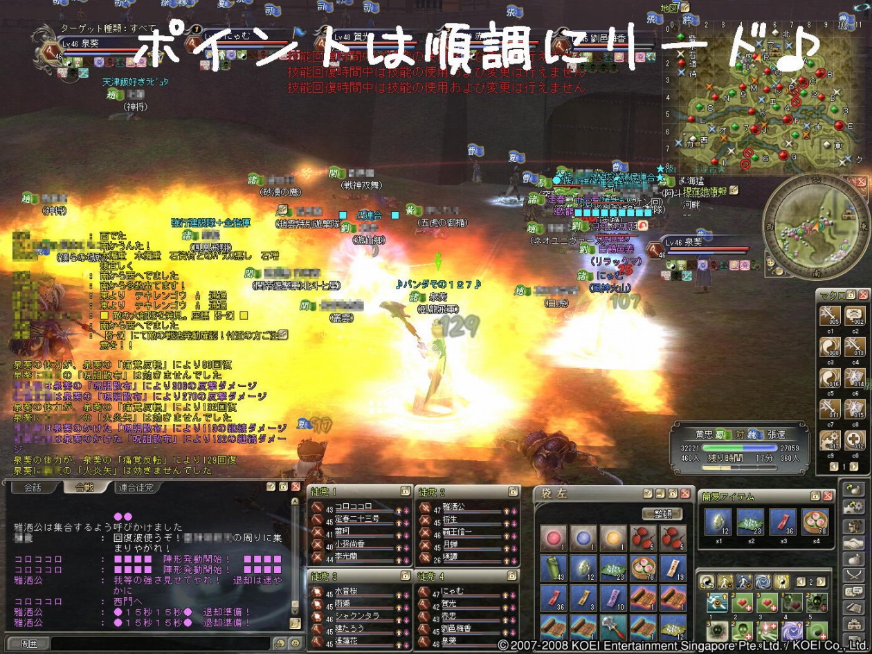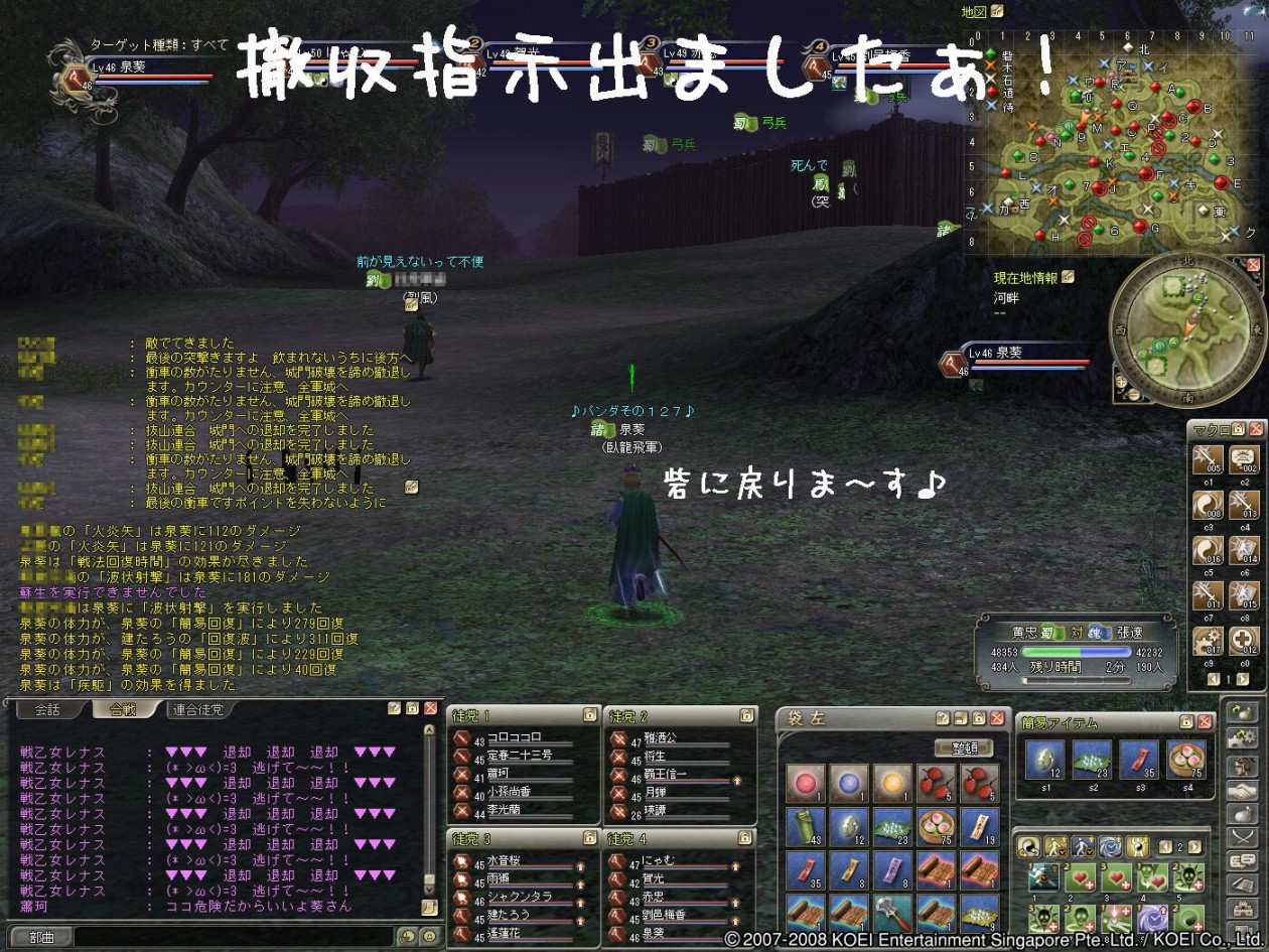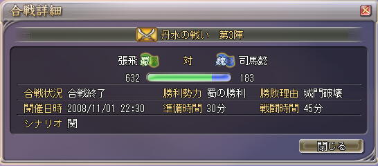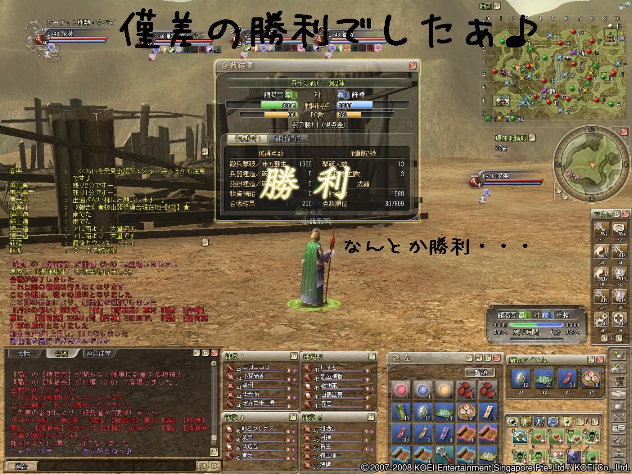 こんにちわぁ~ 合戦の1陣が終わって2陣の再集合中に、ルーターのコンセントを 普通に抜いてしまいました葵でし(T▽T)ダァー 当然ですが、回線は切断されました(; ̄ー ̄A アセアセ・・・ 昨日の合戦は敵と遭遇する事が多かったので、SS撮るタイミングが難しかったです>< 参加した合戦画像をドゾ━━゜+。v(。・ω・。)v゜+。━━ゥ♪ 1陣で~す♪ 偶然なのか伏兵に狙われる事が多かったですね・・・>< 逆に盟主の読みもあって、敵と遭遇する回数も普段より多かったので忙しい合戦でした♪ 蘇生も何度かやりながら呪詛もいいタイミングで撒けました^^ 敵城門前でムリな蘇生は避けて、次の徒党速化で蘇生したので死亡数も少なくなりましたぁ♪ ムリな蘇生もしないで(蘇生しなくていいよ!って言われちゃいました)ポイントリードのまま 砦に退却しました(; ̄ー ̄A アセアセ・・・ 1陣は勝利で終わりましたぁ♪ 個人結果は14撃破1死でポイント獲得に貢献出来ました・・・と思います^^; 2陣で~す♪ 途中参加なので、いつも撃破数は下がる事が多いんですけど、突撃先に敵が多く、 逆に突撃される回数もあってSS撮るヒマがない陣でした・・・ 激しい陣でした(; ̄ー ̄A アセアセ・・・ 個人結果は13撃破3死で、死んだ回数は蘇生もらってからすぐに突撃もらったもったいない 死亡数デシタ・・・(蘇生してくれた方には申し訳ないでし><) これで2勝したので総合勝利確定で~す(*^∇^*)☆・゚:*ぉつかれさまぁ☆・゚:* 3陣は2陣参加中に城門破壊で勝利してました♪ 参加されたみなさん(〃^∇^)oおつかれさまでした~! 押してもらえると、更新の励みになりま~す♪ ↓ ↓ 2008年11月1日(土) 黄河 蜀対魏・丹水の戦い第1陣(湖畔)内容はこちら 2008年11月1日(土) 黄河 蜀対魏・丹水の戦い第2陣(渓谷)内容はこちら 2008年11月1日(土) 黄河 蜀対魏・丹水の戦い第3陣(関)内容はこちら PR この記事にコメントする