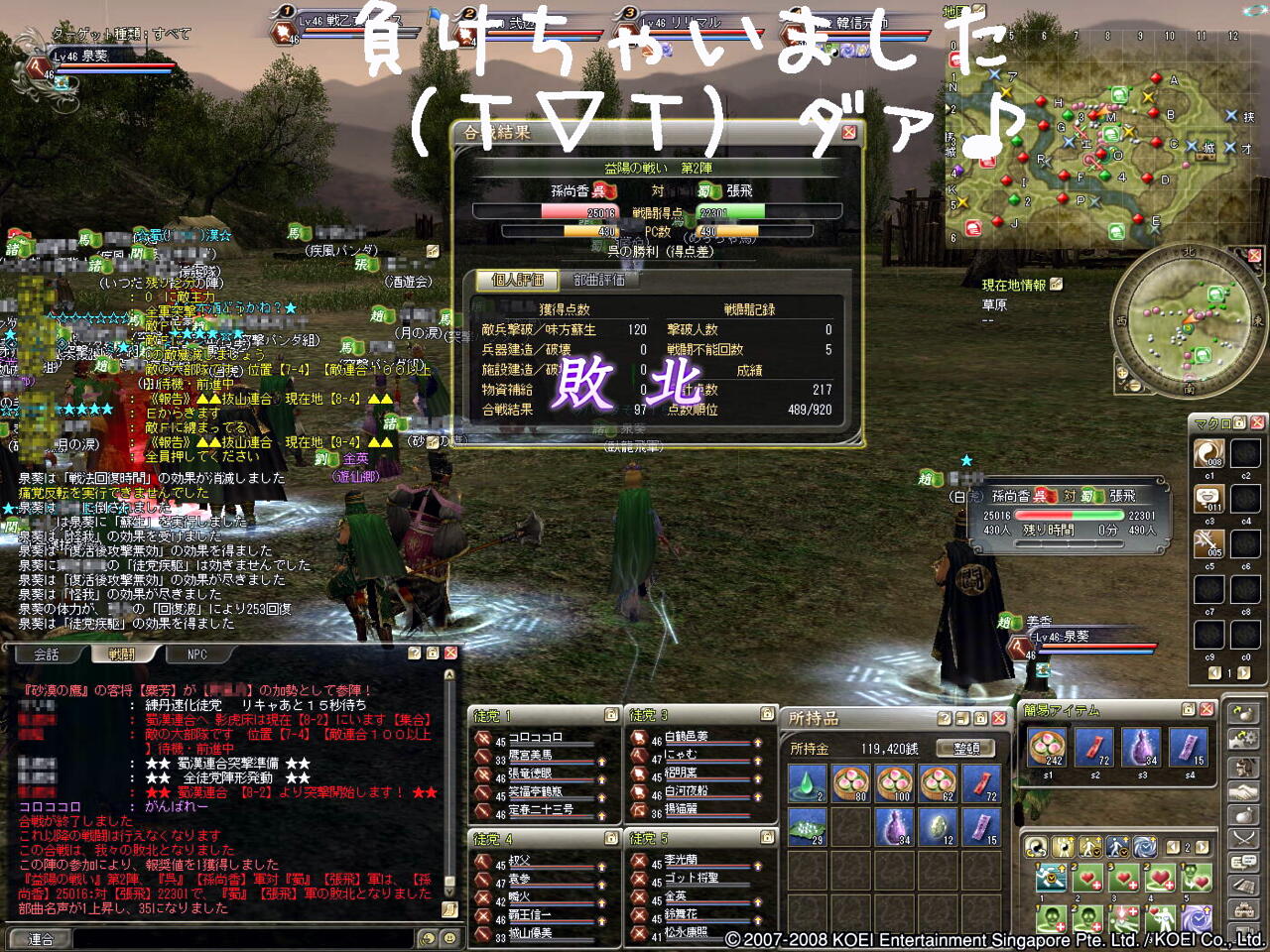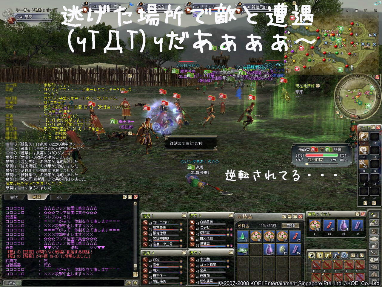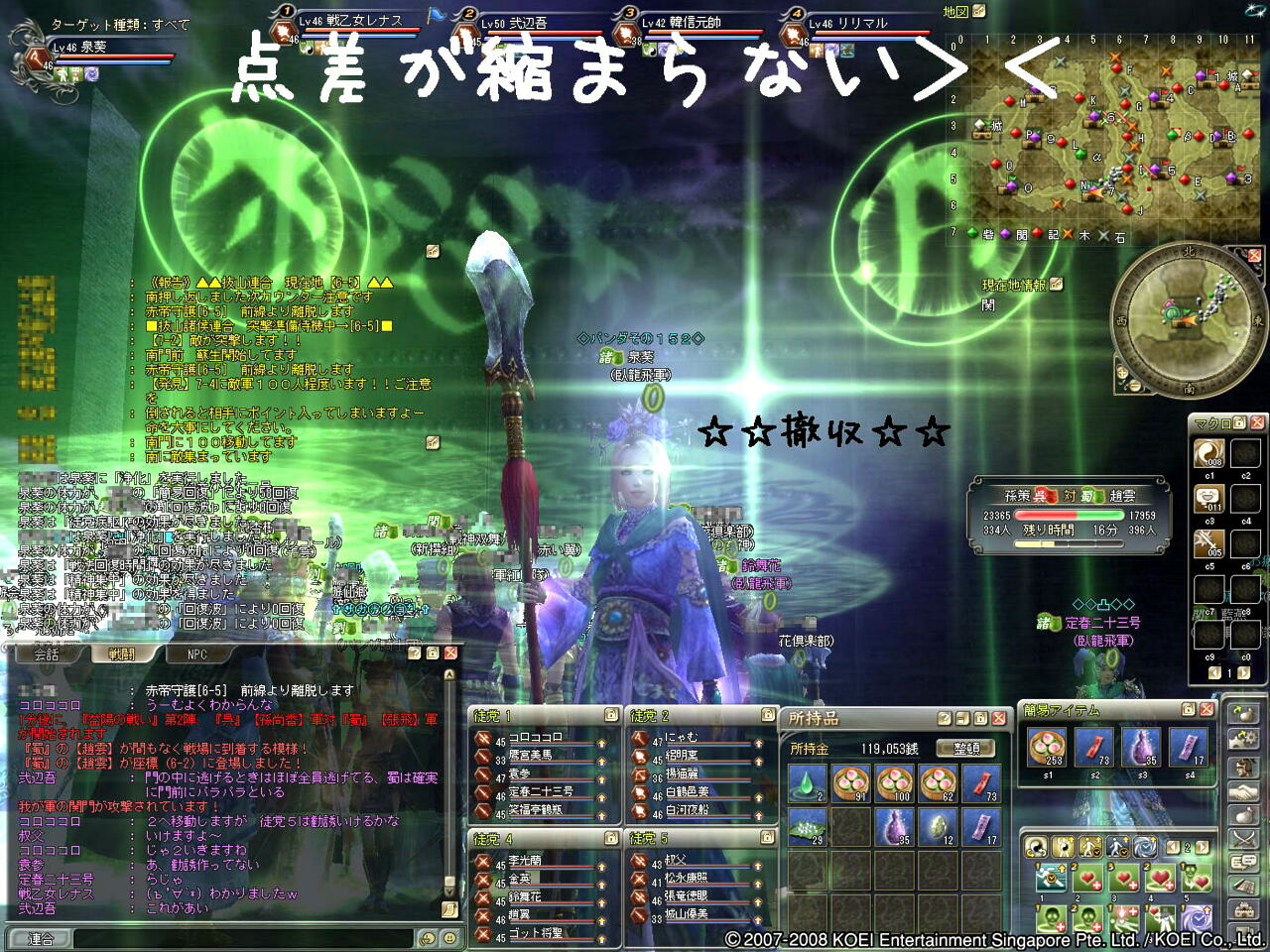 × [PR]上記の広告は3ヶ月以上新規記事投稿のないブログに表示されています。新しい記事を書く事で広告が消えます。 採集と生産ばかりで、狩りという2文字を忘れかけてまふ・・・ 関の中で待機しながらポイントの動きを見てますた^^; 点差が変わらないので2陣移動することになりました・・・>< 2陣勝負に切り替えました^^; 関って篭城されると、なかなか点差が変わらないでし(T▽T)ダァ♪ 2陣へ移動して順調に進みましたぁ♪ 1陣か3陣終わった人が2陣に入ってからは、ポイント差も一気に無くなりますた・・・ この時間からポイントも逆転されちゃいました。。。 呉の動きもまとまってて突撃⇒撤収も早かったでし>< 2陣はポイント差で負けちゃいましたぁ~(T▽T)ダァ♪ 呉の独走をそろそろ止めたいでし・・・orz 1陣敗北!3陣勝利で1勝2敗の総合負け(yTДT)yだあぁぁぁ~ 気持ちを切り替えましょ(; ̄ー ̄A アセアセ・・・ 押してもらえると、更新の励みになりま~す♪ ↓ ↓ ![]() 2008年11月23日(日) 黄河 魏対蜀・益陽の戦い第1陣(関)内容はこちら 2008年11月23日(日) 黄河 魏対蜀・益陽の戦い第2陣(草原)内容はこちら 2008年11月23日(日) 黄河 魏対蜀・益陽の戦い第3陣(湖畔)内容はこちら PR この記事にコメントする