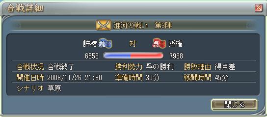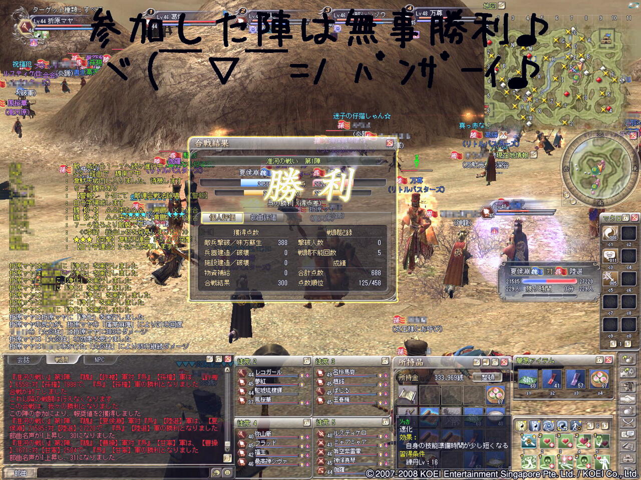 こんにちわぁ~ 昨日から露店を始めますた葵です(超遅 軍略三昧も飽きてきたので、露店でお金を稼いでいまふ♪ でも自作の武器と医食は、まだまだ先になりそうでし>< 昨日は泰山呉の合戦に参加しましたので続きをどぞぉ~! 同時開催だったので、1陣に参加しますた♪ 部曲で連合を組まなかったので、合戦前に連合募集を探しておじゃましますた! 募集で参加は初めてなので、ちょっと緊張しました・・・ いつもの丹参加なので、浄化と回復と蘇生メインでしたね♪ 1陣の参加人数がほぼ同じだったので、かなり苦戦するかな?と思いましたけど、どこかの連合が ポイント稼いでくれたので一気に後半は引き離しましたぁ! 知らない連合に入ってみると、イロイロ学ぶことが多いですねぇ~ 1陣はポイントリードのまま勝利しましたぁヾ( ̄∇ ̄=ノ バンザーイ♪ 合戦中で役に立たなかったのはいつもの事でし・・・(; ̄ー ̄A アセアセ・・・ 2陣・3陣も勝利で3タテですた♪ おみごとでした♪~♪ d(⌒o⌒)b ♪~♪ルンルン 押してもらえると、更新の励みになりま~す♪ ↓ ↓ ![]() 2008年11月26日(水) 泰山 呉対魏・淮河の戦い第1陣(渓谷)内容はこちら 2008年11月26日(水) 泰山 呉対魏・淮河の戦い第2陣(関)内容はこちら 2008年11月26日(水) 泰山 呉対魏・淮河の戦い第3陣(草原)内容はこちら PR この記事にコメントする