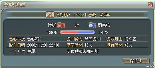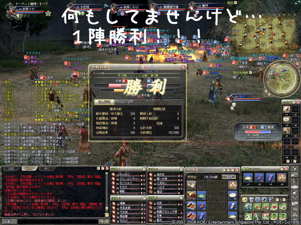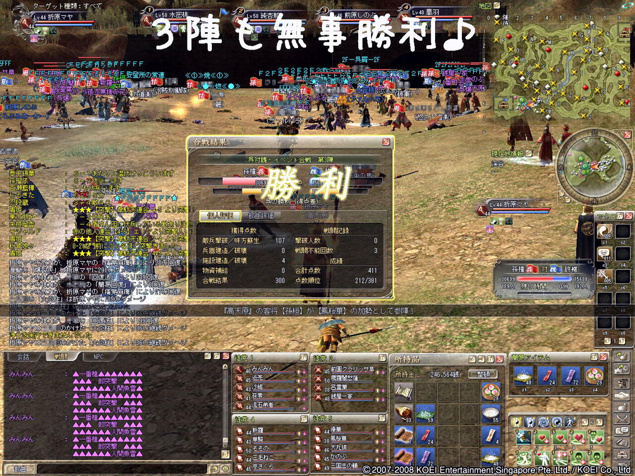 こんにちわぁ~ 気軽に生産依頼していたツケが、今頃まわってきた葵でし>< 年内までには、何か一つくらい自作で使えるモノを作れるようになりたいですねぇ・・・ 昨日は採集&生産をまったくやってない、泰山呉キャラの合戦日ですた! 今回の合戦も部曲でフリー参加だったので、連合に拾ってもらいました合戦内容をどうぞぉ~♪ 1陣で~す♪ 今回は2・3陣が同時開催だったので、1⇒3の動きですた^^ 門破壊しないで相手が出てくるところを狙い撃ちパターンでしたが、今回は魏も同じ考えだったのか 待機時間が多かったよ~な気がしまふ・・・(’’ 南に移動してからも待機時間が長かったですが、しっかりポイントはリードしてたので後半に 突撃してくるところを狙ってました♪ 待ち時間にイロイロSS撮って遊んでましたけど、間違えて画像をまとめて消しちゃいますた>< あまり活躍が無かった陣でしたけど、1陣は勝利しましたぁヾ( ̄∇ ̄=ノ バンザーイ♪ 関は個人的にキライじゃないんですけどね(; ̄ー ̄A アセアセ・・・ 3陣で~す♪ 敵城門まで移動して突撃⇒撤収パターンでした! 城門前にはお約束で、死体の山がたくさんありました(yTДT)yだあぁぁぁ~ ひたすら蘇生していたら、背後からイヤ~な殺気を感じますた・・・ 忘れた頃にやってきた”いらっしゃいませ武将様♪”でし>< いきなりザクっ♪とダメージもらったので、伏兵かな?と思ったら 次の瞬間に『封』の文字が(T▽T)ダァ♪ 逃げながら簡易回復入れましたけど、まったく意味ありませんですた・・・orz 今回もごちそうさまですた・・・ ( ̄-  ̄ )ごっ \( ̄ -  ̄ )つぁん (  ̄ -  ̄)/です! 3陣もポイント逃げ切りで勝利しましたぁ~オメデト♪(*⌒ー⌒)o∠★:゜*ポン♪ 個人成績は・・・ほっといてくださいw 3陣と同時開催の2陣も得点差で勝利してましたぁ才×〒"├♪(⌒▽⌒)ノミ☆゜ 前回に引き続き3タテで総合勝利でしたねぇ♪(イベ戦ですが・・・) この勢いで連勝記録を伸ばしましょ~!! 押してもらえると、更新の励みになりま~す♪ ↓ ↓ ![]() 2008年11月28日(金) 泰山 呉対魏・イベント合戦第1陣(関) 2008年11月28日(金) 泰山 呉対魏・イベント合戦第2陣(渓谷) 2008年11月28日(金) 泰山 呉対魏・イベント合戦第3陣(草原) PR この記事にコメントする
