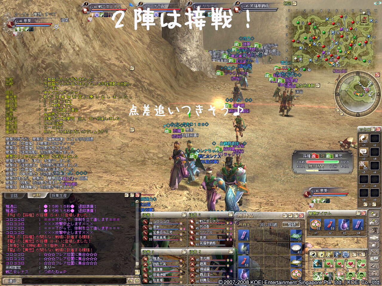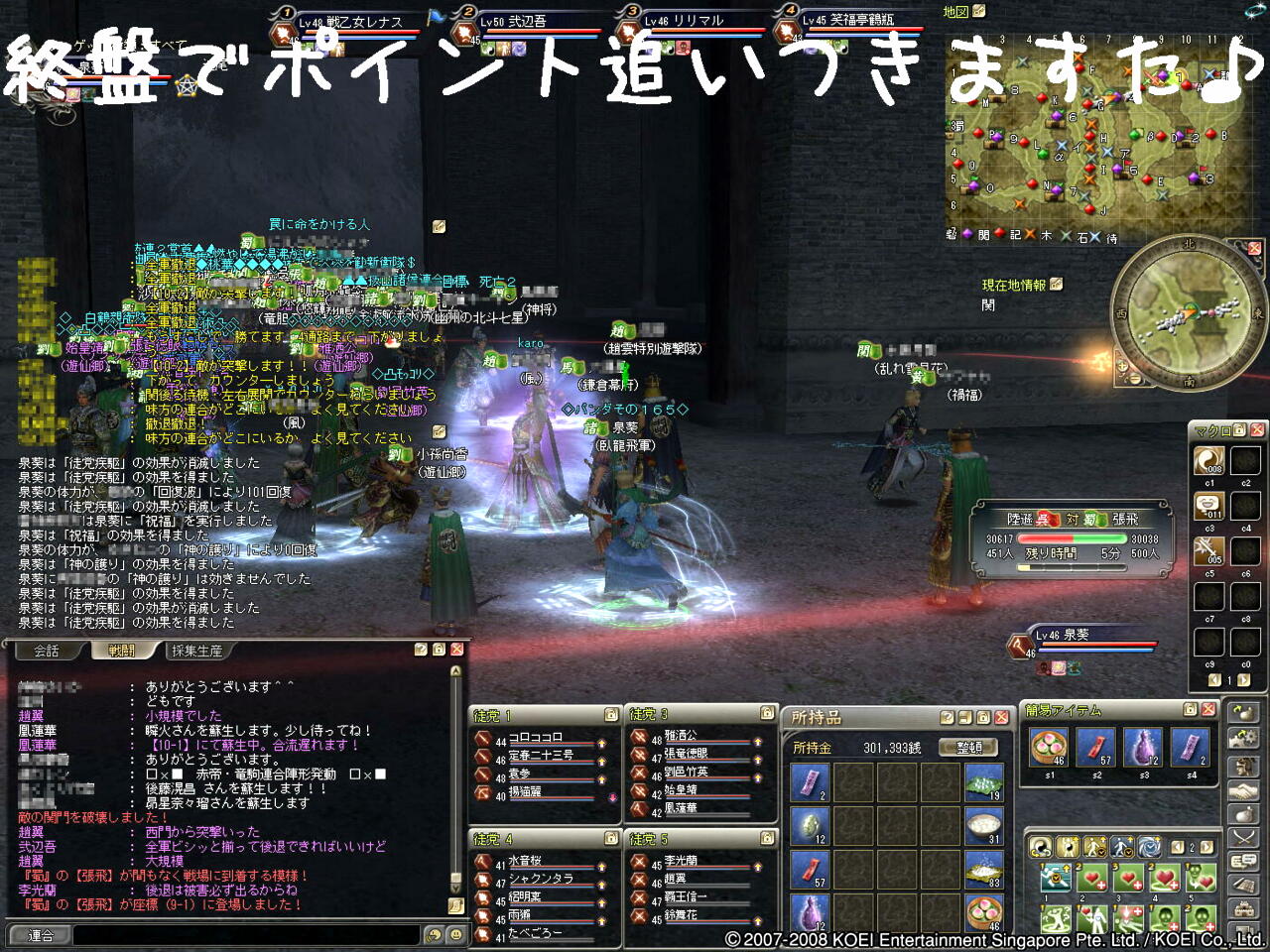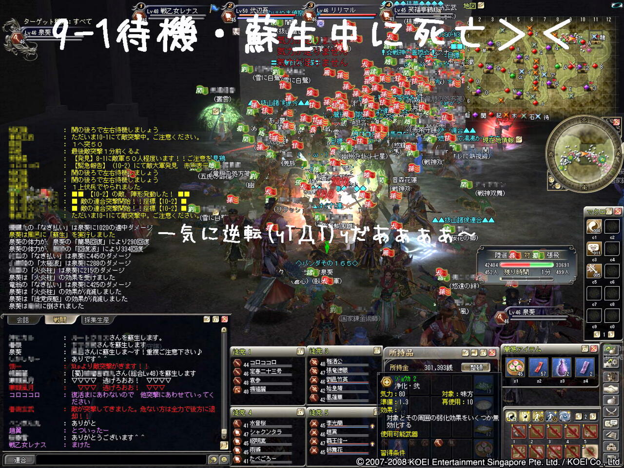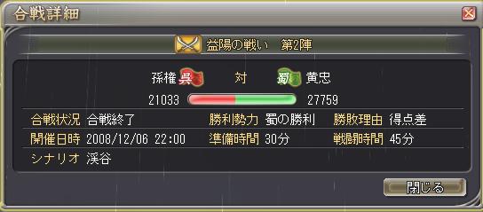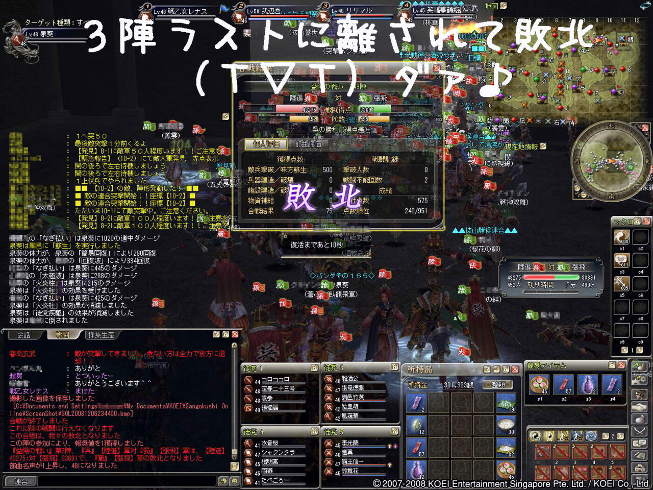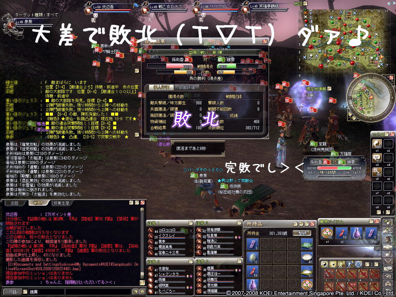 こんにちわぁ~ ネタが無くても訪問して下さる皆さんに感謝の葵でし! このブログはリンクフリーなのでご自由にどぞ♪ 中身は『三国志オンライン』ネタしかありませんので、迷い込んだ不幸な方はこれを機に 体験版でプレイをオススメしまふw このブログをカンタンに説明しますと、 ①攻略内容はほぼ皆無でし・・・(攻略は他力で教えてもらってまふ)w ②管理人は練丹しかやりません!今となっては過疎化した丹ですが、 丹を愛するブログですw ③対話・フレ登録大歓迎でし!合戦中でもど~ぞ(該当する方へ:ネタにしてスミマセン^^;) ④黄河・泰山ネタしかありません。廬山にキャラ作るヒマないので^^; 中身は薄いブログですが、今後ともヨロシクお願いしまふm(_ _)m 昨日は黄河蜀の合戦ありますた。続きをどうぞ^^ 1陣で~す♪ 突撃しても点差が広がっちゃいました>< 呉はまとまって突撃⇒即撤収⇒第二波突撃⇒即撤収でポイントを刈りとられましたね・・・ 地形もうまく使ってるなぁ~と感想を^^; 橋の手前の坂で待機して、蜀が橋を通過するタイミングを計って狙い撃ちされますた>< 現場からお伝えします!(東○林のり子風に) 突撃しても距離が遠くて、陣形効果が切れそうなタイミングでカウンターもらっちゃいました>< 点差は追いつけないほど、ほぼ絶望的になりますた・・・orz 見事なやられっぷりでした(T▽T)ダァ♪ 終盤は決死覚悟で突撃しちゃいましたね・・・ 1陣は大差で敗北でし>< 2陣で~す♪ この陣も負けちゃうと、呉は正装ゲットがかかってるので負けられない合戦ですた。 盟主の判断も良くて、大連合での突撃が功を奏して中盤からポイントを一気に詰めましたぁ♪ 突撃から撤収中の呉連合軍を、横から壊滅したりでポイントも逆転した時間帯でし! 撤収!篭城指示出ました! ウチの連合は先に2陣から3陣へ移動が決定したので、残った皆さんで2陣リードを守って もらいますた。 2陣は残った蜀の皆さんが得点差リードを守ってくれて、無事勝利しましたぁ ヾ( ̄∇ ̄=ノ バンザーイ♪ 勝負は3陣の結果となりますた・・・ 3陣で~す♪ 終盤まで僅差の得点差でした・・・ 一時的にポイント逆転しても、すぐひっくり返されたりで接戦でしたが・・・ ポイント逆転されてから敵城門前に突撃⇒カウンターで一気にポイント差が広がっちゃいますた・・・ 勢いは待機場所まで来て、突撃の呉に轢き殺されちゃいました(T▽T)ダァ♪ 大量の死体の山と同時に、ポイントも一気に引き離されて負けちゃいました(T▽T)ダァ♪ 最後以外は良い流れだっただけに惜しかったでし>< 次の呉戦は今回の陣を教訓にがんばりましょ! 押してもらえると、更新の励みになりま~す♪ ↓ ↓ ![]() 2008年12月6日(土) 黄河 益陽の戦い第1陣(湖畔) 2008年12月6日(土) 黄河 益陽の戦い第2陣(渓谷) 2008年12月6日(土) 黄河 益陽の戦い第3陣(関) PR この記事にコメントする