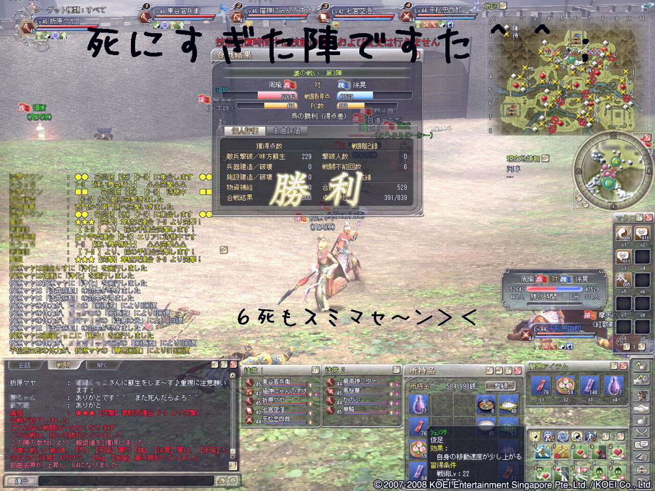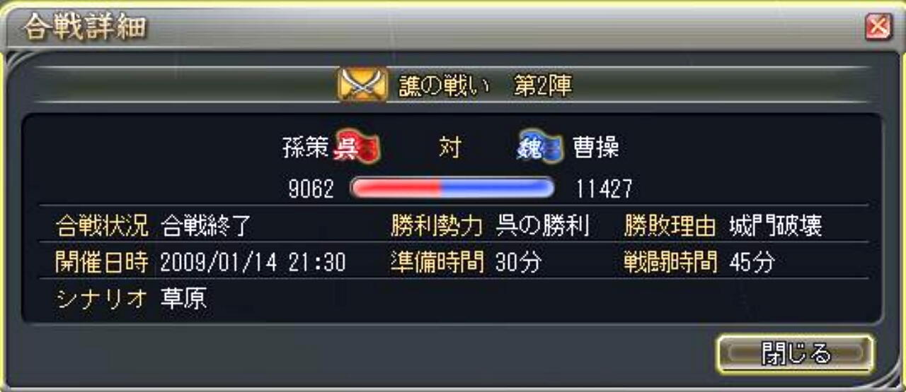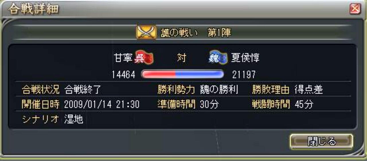こんにちわぁ~ 視力が普通なので、メガネもコンタクトも入れてません葵でし♪(たしか左右1.0) 会社の健康診断はまだ先なので、今の視力っていくつかわかりませんけど、恐らく確実に 下がってますねぇ・・・文字が見えにくくなってきますた>< 注:合戦のログ流れが早くて見落とすのはいつもの事ですw 皆さんもゲームのやりすぎには注意してくださいねぇ~♪(~-~;)ヾ(-_-;) オイオイ 話は変わって、新しくリンク先を追加しましたぁ~ヾ(>▽<)ゞ 盧山鯖の呉に所属されてます聖小野様の『聖なる奇跡(軌跡)』と 相互リンクしてもらえる事になりますた♪ 毎回愛読させてもらってますブログ様で、更新回数の多さとネタの面白さに引き込まれます 超オススメのブログで~す! ちなみに盧山はキャラがいないので、昨夜のうちにキャラ作成も済ませますたw 合戦は参加出来ませんけど、名前は黄河と同じ『泉葵』なので見かけた盧山の読者様は どうぞヨロシクなのでし♪( ̄▽ ̄)σオマエカ! ちなみに盧山鯖で21:30から『クイズ大会』が開催されるみたいでし! 詳細は『三On盧山イベントインフォメーション』をご覧くださ~い♪ またまた話は変わりまして、昨日は泰山呉で合戦に参加してきました! 過去に無いほどの戦犯な結果でしたが、続きをど~ぞ^^; 1陣で~す! 今回は1と2陣が同時開催だったので1陣から参加しますた^^ 部で連合組んでましたけど、動きはフリーだったので陣形も数回使ったくらいでしょ~か・・・ 投石で何度も死んだり、敵に挟まれたりで戦果はボロボロですた・・・orz 点差も縮まらなかったので、合戦途中に3陣へ移動しちゃいました^^; 恐ろしいくらいの役立たずでした(T▽T)ダァ♪ 途中で抜けたので個人成績は残りませんでしたけど、1陣は惨敗ですた・・・ 1陣で必死に防衛中でしたが、(響きは良いですが何もしてませんw)1陣参加中に2陣が速攻で 城門破壊してくれましたので、2陣は勝利しましたぁo(≧∇≦o)(o≧∇≦)o 勝敗の行方は3陣へ・・・ 3陣です! ムリ蘇生・壱が発動して、連合の方に何度も蘇生してもらいますた>< ちょっと反省して、遠くから『回復波』と『浄化』を使っていたらまばゆい光とともに 何かが横切って行きますた・・・ 2009年も健在だったよ~でし・・・orz 『帰ってきた!いらっしゃいませ~武将様シリーズ♪』泰山編・・・ (帰ってこなくていいんですけどw) 徐晃様がバシバシ暴れてくれましたwww 久々に「ごちそうさまでした・・・」(T▽T)ダァ♪ 3陣は6死の大戦犯な結果ですた>< 次回は戦果を上げるよ~がんばらせていただきまふ^^; 結果は勝利で総合でも勝利しますた♪ 押してもらえると、更新の励みになりま~す♪ ↓ ↓ 2009年1月14日(水) 泰山 譙の戦い第1陣(湿地) 2009年1月14日(水) 泰山 譙の戦い第2陣(草原) 2009年1月14日(水) 泰山 譙の戦い第3陣(湖畔) PR この記事にコメントする