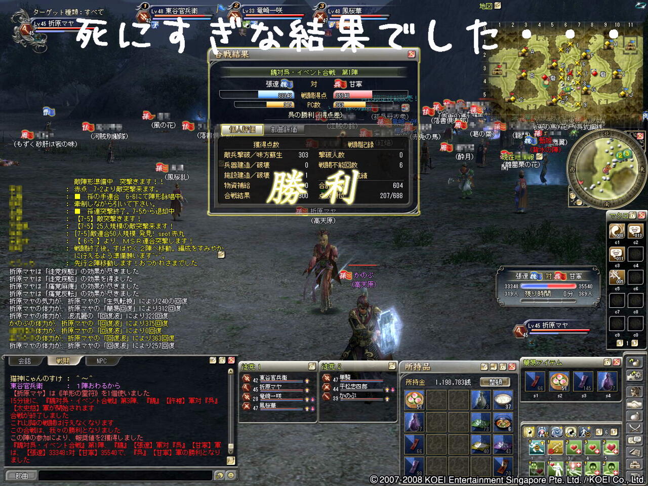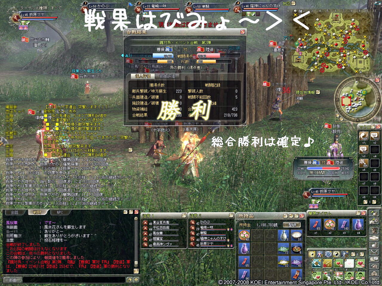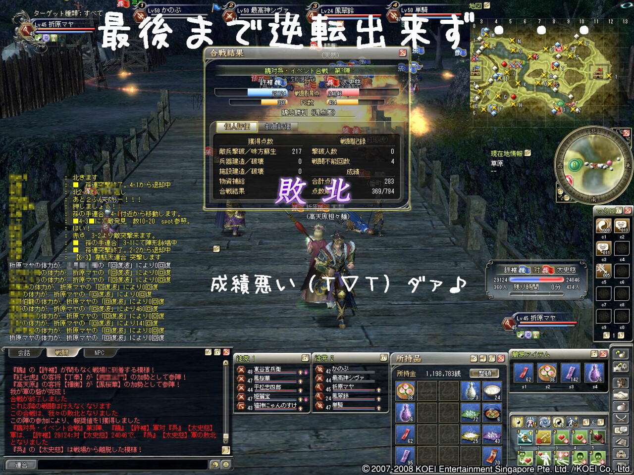 (廬山でも対話と勧誘ありがとでした♪) こんにちわぁ~ 鯖間をあちこち移動するので神出鬼没な葵でしw メインは黄河ですが、泰山で生産も少しずつ始めたので滞在時間も増えてきました^^ 見かけたらど~ぞ(ヾ(´・ω・`)ノヨロシク(o´_ _)o)ペコッ 昨日は泰山呉で合戦に参加して来ましたので、続きをどぞ! 1陣で~す! 部で連合組みまして、動きはフリーといつもの流れでしw 泰山呉ではその日の流れと、制覇戦によって連合に入ったりと自由なのでし♪ 序盤は索敵しながら罠作ったり蘇生したりで、轢かれて死亡する回数が多かったのでした>< 自動技能のありがたさが最近よくわかりました^^; 蘇生も迅速あると早いですし、俊足・改あると逃げ遅れも少ないですねぇ~・・・ 竹運が悪いので、レア技能は未だに少ないでし(T▽T)ダァ♪ 今回もA級戦犯な結果ですた・・・ 泰山呉からそろそろ追い出されそうな結果が続いていまふ(; ̄ー ̄A アセアセ・・・ 結果は1陣勝利しましたぁ~ヾ( ̄∇ ̄=ノ バンザーイ♪ 2陣で~す♪ ヒーラー技能しか使ってませんので、回復系と蘇生メインはいつもと一緒でし^^; 一気に制圧して進みましたので、前衛で倒された人を起こしてました♪ 橋手前の待機場所でし♪ ここから橋と奥で倒された人の蘇生と、ドコかの突撃連合に合わせて 回復&浄化してますた^^ 2陣も得点差で勝利しましたぁ♪~♪ d(⌒o⌒)b ♪~♪ルンルン 総合勝利確定しましたので、そのままのイキオイで3陣へ・・・ 3陣で~す♪ 時間が経つにつれて、点差が広がっていきましたぁ~(T▽T)ダァ♪ 早くも敗色濃厚な展開でし・・・ 得点差をちょっと詰めましたけど、最後まで逆転出来ませんでしたねぇ>< 死亡数が多い結果なので、ちょっと| 柱 |ヽ(-.-;) 反省 次回またがんばりまふ(; ̄ー ̄A アセアセ・・・ 押してもらえると、更新の励みになりま~す♪ ↓ ↓ 2009年1月16日(金) 泰山 イベント合戦第1陣(関) 2009年1月16日(金) 泰山 イベント合戦第2陣(湖畔) 2009年1月16日(金) 泰山 イベント合戦第3陣(草原) PR この記事にコメントする