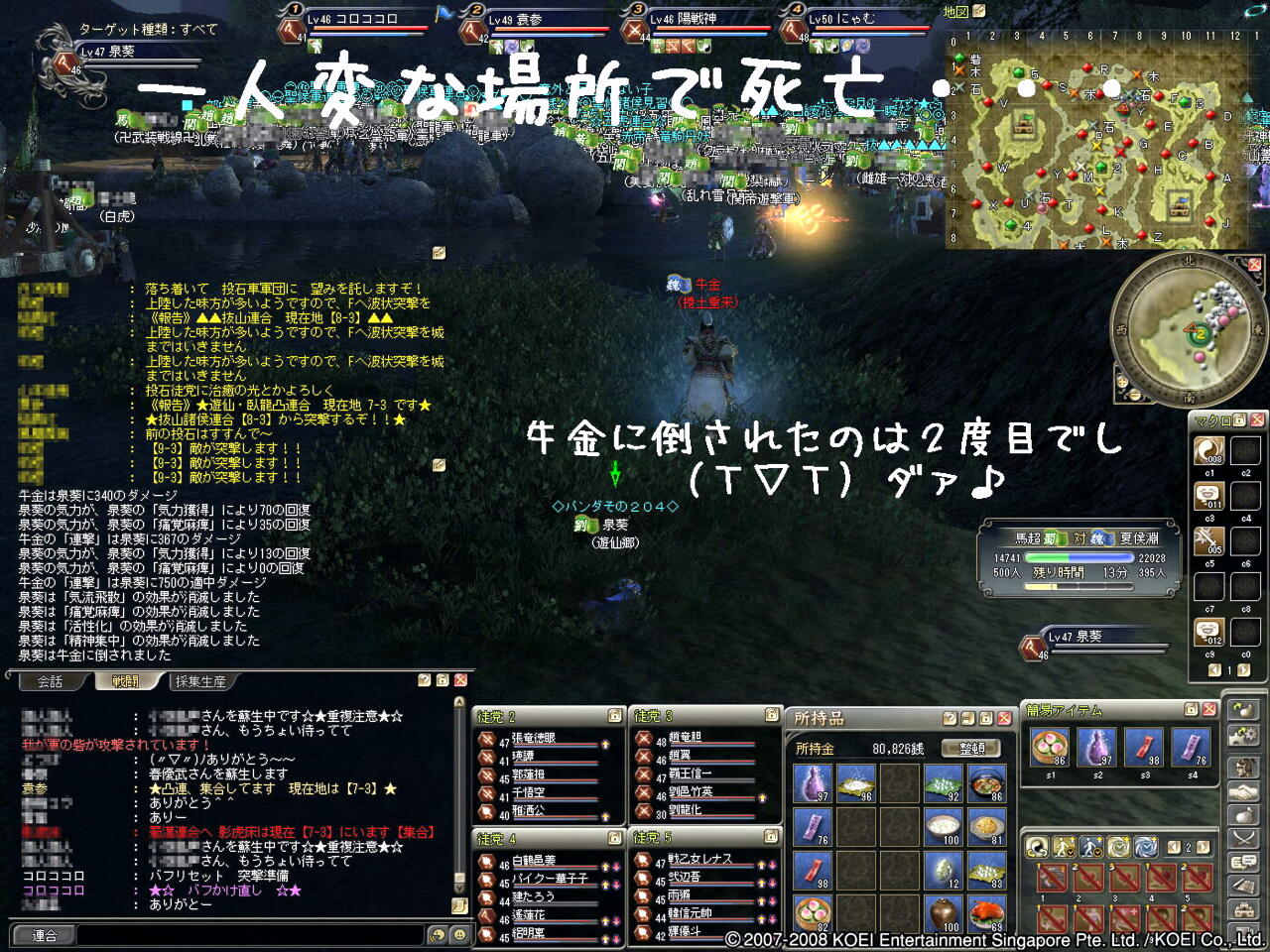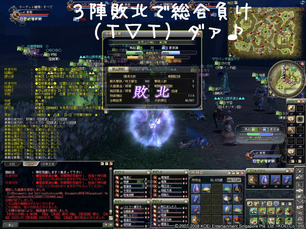 こんにちわぁ~ 最近はアクセ製造がマイブームの葵でし♪ (ちなみにまだレベル41ですけど・・・) 自給自足までまだまだですけど、元素使った製造もそろそろやりたいので、元素集めツアーあれば 誘ってくださいねぇ^^; それでは昨日の黄河蜀で参加した合戦ですが、事前に作戦もあったよ~なので内容をどぞ! 1陣で~す♪ 全員で敵城門突撃の作戦でした^^ 東側から一気に制圧して、短期決戦の城門破壊が目的だったんですけど 城門の耐久が残り10%で力尽きますた(T▽T)ダァ♪ 今回の連合は丹の参加も多かったですねぇ~Σ( ̄□ ̄;オォォ!! 湿地並みの回復と浄化しながら混乱も入れてましたが、城門破壊失敗で得点差が今までに 無いほどついちゃいました>< 得点差勝利が難しくなったので再び門叩きしてましたけど、得点差はひらく一方でした・・・ 1陣は大敗北でした(yTДT)yだあぁぁぁ~ 結果はしょ~がないですけど、次の合戦に活かして欲しいでし^^; 2陣で~す! 1陣参加中に短期決戦で勝利してましたぁヾ( ̄∇ ̄=ノ バンザーイ♪ 決戦の勝敗は3陣へ・・・ 3陣で~す! 湿地戦なので、最初は素材集めからスタートしました♪ 過去に開始してから採集技能セットを忘れた事あったので、今回はちゃんと 忘れずに採集参加しますた^^; 回復波と浄化を入れてたら、客将が向かって来ますた(T▽T)ダァ♪ パニックになって、なぜか隠れようとした葵の逃げ場所は 湿地の岩陰でしw 当然見つかって倒されましたけどね(; ̄ー ̄A アセアセ・・・ 変な場所で死んでいたのはこんな理由でした>< 牛金に倒されたのは2度目でし(T▽T)ダァ♪ 今回もごちそうさまでした・・・ 3陣も負けちゃいましたので、総合負け確定しますた(T▽T)ダァ♪ 悔しいですけど、今日も合戦あるので黄河蜀の皆さんがんばりましょ~! 押してもらえると、更新の励みになりま~す♪ ↓ ↓ 2009年1月17日(土) 黄河 老君山の戦い第1陣(湖畔) 2009年1月17日(土) 黄河 老君山の戦い第2陣(関) 2009年1月17日(土) 黄河 老君山の戦い第3陣(湿地) PR この記事にコメントする