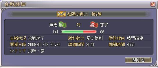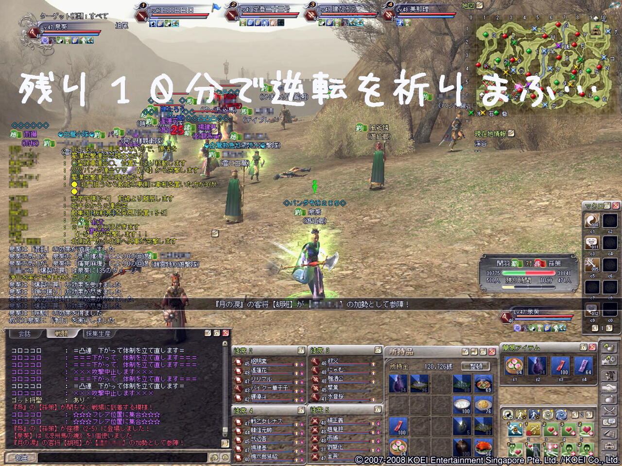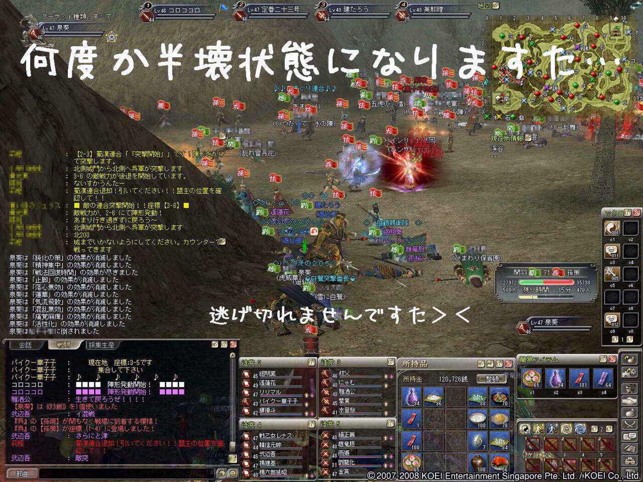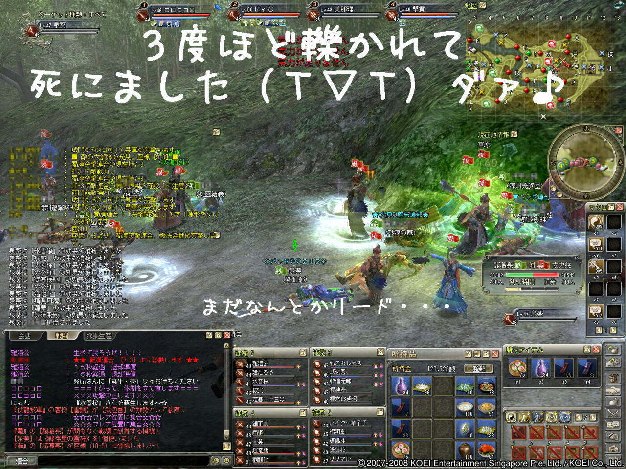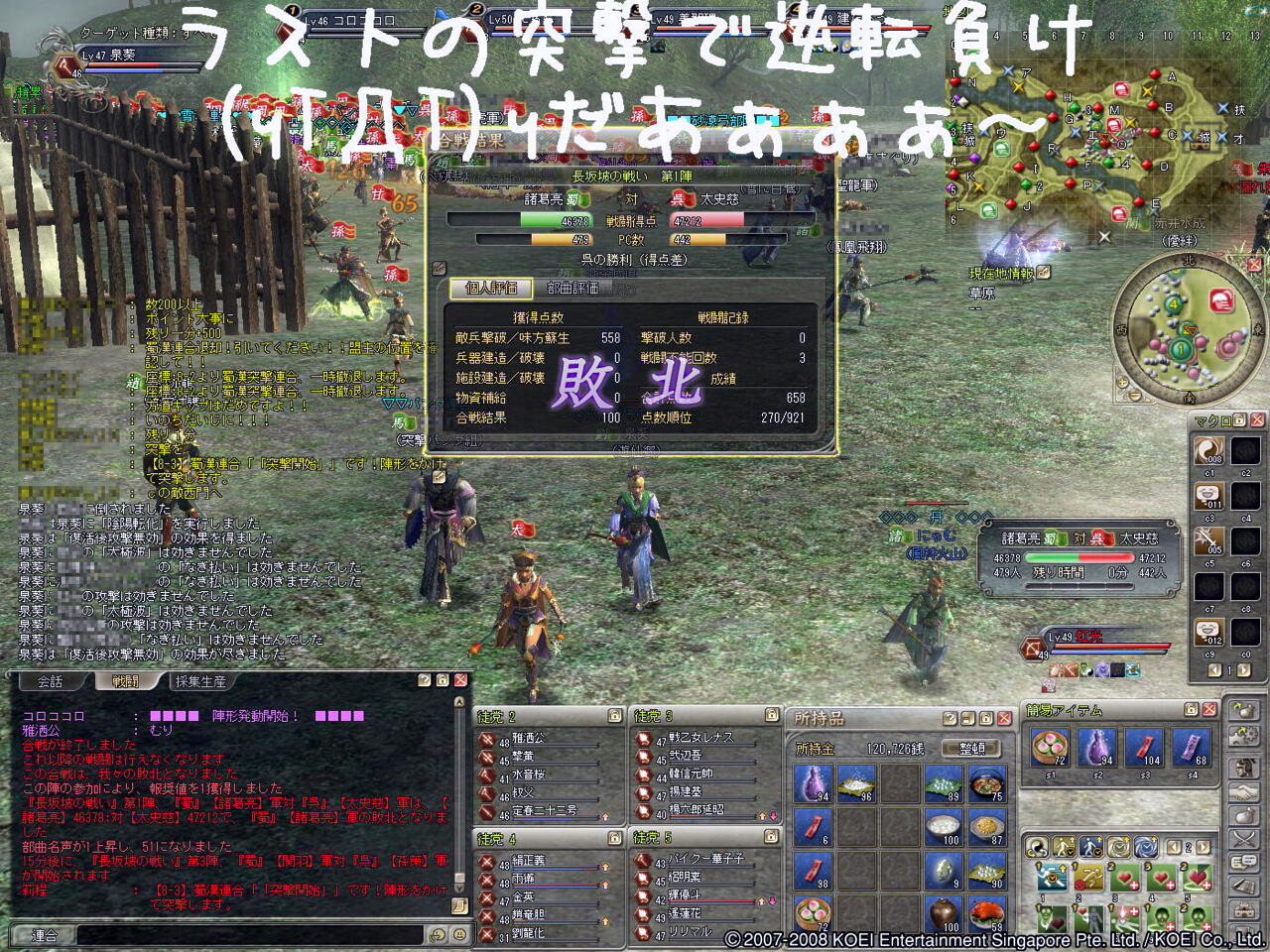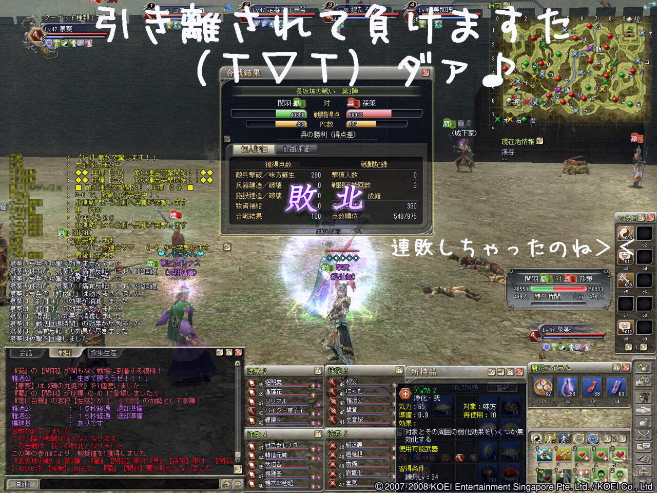 こんにちわぁ~ 今年の制覇戦が再開して、未だに勝利の無い黄河蜀に所属の葵でし>< 昨日の合戦結果からお伝えすると、対呉戦に総合負けしちゃいますた(T▽T)ダァ♪ これで制覇戦が4連敗と重症でし・・・orz 惜しい陣も何度かありましたけど、決して士気が悪いと思わないですけどねぇ(; ̄ー ̄A アセアセ 総合負けしちゃいましたけど、いつもど~り内容をお届けしますのでどぞ>< 1陣で~す! 結果論じゃないですけど、この陣が勝敗を左右していたよ~な気がしまふ・・・ 前半から終盤の数分までリードしていましたけど、動きはいつも通りですた! 今まで以上にムリしないよ~注意してますた^^; 索敵が初めてヒットしたのもこの陣でしw 終盤になっても得点差が広がりませんでしたねぇ>< 逆に得点差が詰められて、残り数分に逆転されちゃいました(T▽T)ダァ♪ 逃げる立場から追う立場になってからは、最後の突撃で得点稼ぐしかありませんでした・・・ ラストの突撃も当たり負けしちゃいますた(yTДT)yだあぁぁぁ~ 序盤のリードも逃げ切れず、1陣は無念の敗北でし・・・ 2陣で~す! 速攻で城門破壊の勝利でしたヾ( ̄∇ ̄=ノ バンザーイ♪ そして勝負の3陣へ向かうのでありますた・・・ 3陣で~す! 序盤は南を制圧して調子ヨカッタんですけど、敵陣に近くなってからは相手の 素早い門からの突撃と退きの速さで、一気に逆転されちゃいました(T▽T)ダァ♪ 呉は終盤にムリせず、まとまって突撃して蜀が轢かれるパターンだったよ~な気がしまふ・・・ 蜀が突撃するたびに得点差が一気に開いて、終盤は決定的な得点差になりますた(T▽T)ダァ♪ 最初にお伝えしましたけど、3陣敗北で連敗記録更新しちゃいますた(T▽T)ダァ♪ 過去に黄河蜀は、連敗してからの立ち直りを経験してきた事がありますので、次回の合戦に 期待しましょ~! ※泰山呉キャラで露店放置していた間に、ブログ読者様から対話いただきありがとでした♪ あまり生産するヒマが無いので、コウゾ材売りだけしてまふ(; ̄ー ̄A アセアセ・・・ 見かけたらまた(ヾ(´・ω・`)ノヨロシク(o´_ _)o)ペコッ 押してもらえると、更新の励みになりま~す♪ ↓ ↓ 2009年1月18日(日) 黄河 長坂坡の戦い第1陣(草原) 2009年1月18日(日) 黄河 長坂坡の戦い第2陣(湖畔) 2009年1月18日(日) 黄河 長坂坡の戦い第3陣(渓谷) PR この記事にコメントする