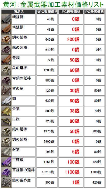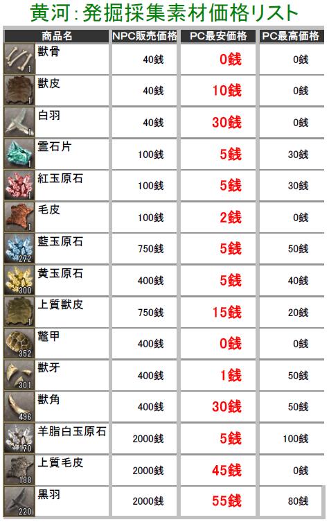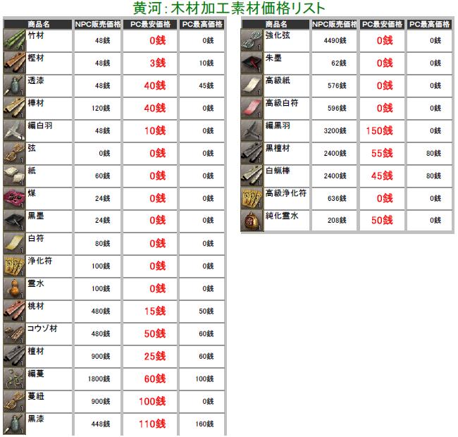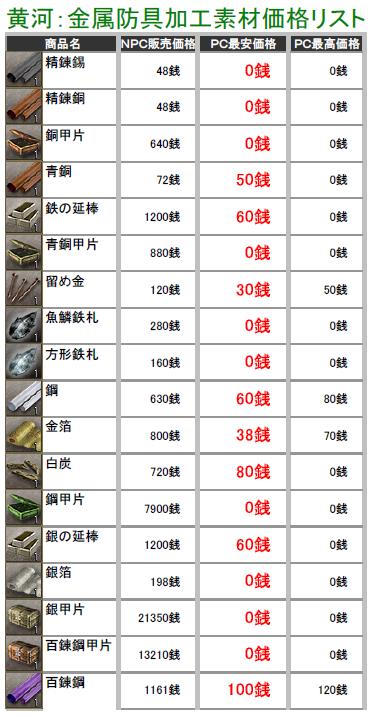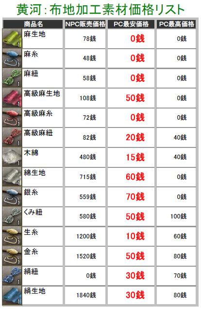 こんにちわぁ~ 最近は生産したアイテムの価格調査してます葵でし♪ 突然ですが、黄河蜀に所属している部曲を抜けることになりますた・・・ 部曲メンも独立して、新しい部曲を立ち上げたりとイロイロ考えているみたいなので 私も一から心機一転で、何か動こうと思い今回の決断をしますた・・・ 勢力移動するつもりはありませんので、蜀にはそのまま残りまふ♪ 一人で部曲を立ち上げる力も無いので、益州のどこかで野たれ死にする前に 他の部曲を探そうと考え中でし! ちなみに行先は決めてません^^; 今の部曲には大変お世話になったので、皆さんに感謝しています(T▽T)ダァ♪ 合戦やどこかで会いましたら、これからもヨロシクお願いしますね^^ 黄河の長安と涼州でちょこちょこと価格調査してみますた! 某なんとか倶楽部さんのパク・・お手本に、私も作成してみましたのでこれからも ちょっとづつ更新していきまふ^^; ※実際に販売している価格しか掲載してませんので、販売されていなかったモノについては 記載していません。 価格表は高レベルのアイテム記載をしていません! 初心者さん向けの価格表になりますので、上級アイテムを確認したい方は残念ながら 今回は掲載していませんのでご了承ください>< 掲載しているアイテムにはプレイヤーさんの採集・加工の手間や等級もありますので 一概に高い!安い!って判断にはなりませんけど参考までにどうぞ^^; (画像をクリックすると拡大されます) 黄河PC売りの販売価格表でし! まずは鉱石・木材・薬草採集のアイテム価格表で~す♪ この記事にコメントする