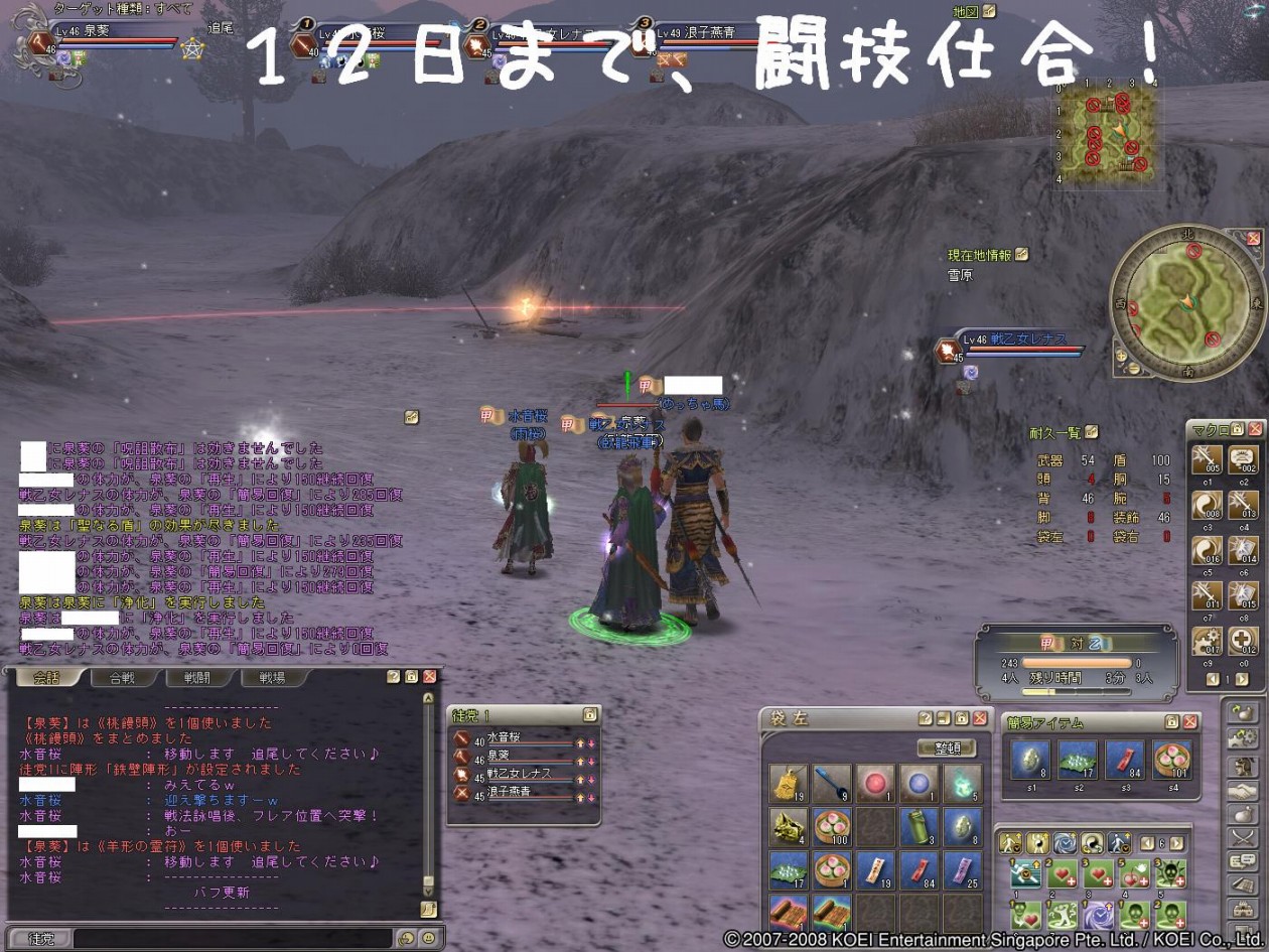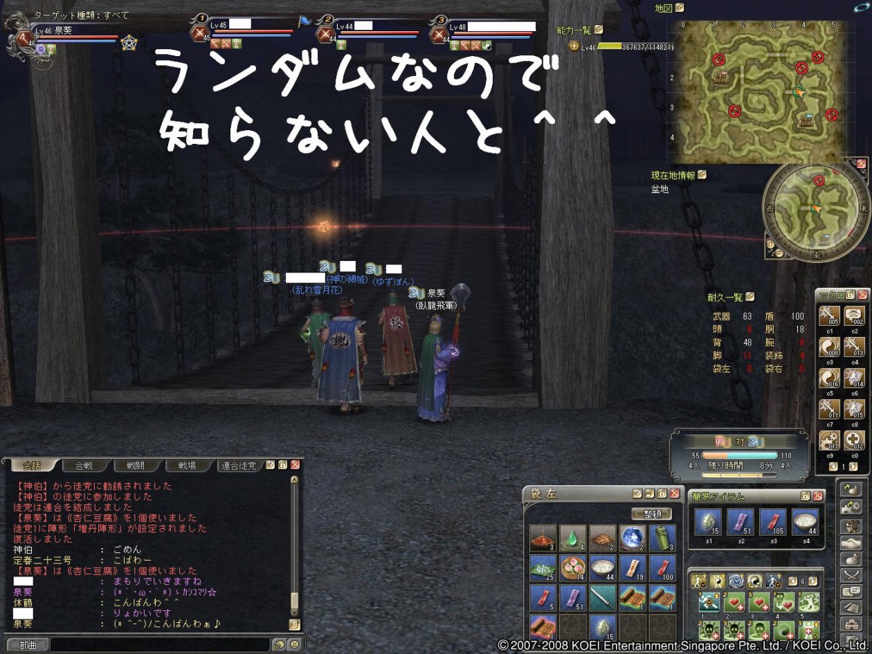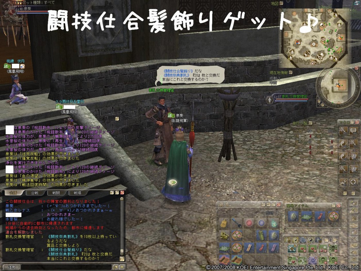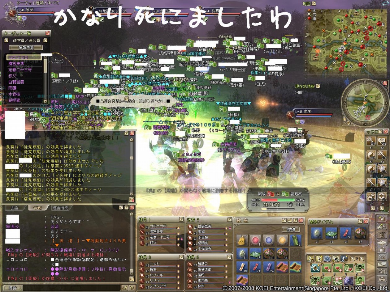 こんにちわぁ~ ヒマなときは”狩り”か”軍略”の葵でし(採集と生産やれぇ!・・と心の叫びが^^;) 身内ネタでの出来事を一つ^^b 1ヶ月ほど前に、このブログの読者で元部曲員が蜀から魏へ寝返った事件がありました! 昨日益州で彷徨っているところを、無事保護しましたぁ~(〃^∇^)o_彡☆ァハハハッ!! まぁ、イロイロあったみたいですけどおかえりなさいませぇ~♪ もう反乱しちゃダメですよぉw そこで狩り希望の人数を集めたら7~8名ほどが揃ったので、”涼州”へ狩りに行ってきますた^^ 盾さんがかなりのMobを釣って、それを待っていた他のメンバーが狩るってパターンでしたが これが噂の”トレイン狩り”って始めて知りました-ε-ε-ε-ヘ(||′囗`*)ノ゙ ぎゃぁ 周辺で狩りをしていた一部の皆さんにはご迷惑をかけました・・・p[スミマセン]q・ω・`O) 相変わらず情報が遅い葵です>< 押してもらえると、更新の励みになりま~す♪ ↓ ↓ PR