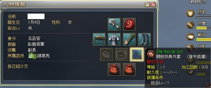 得意技:初心者っぷりは変わらず!まだまだでし>< 『三國志 Online』に関わる著作権、その他一切の知的財産権は、株式会社コーエー及びシンガポール国法人であるKOEI ENTERTAINMENT SINGAPORE Pte. Ltd.に帰属します。 このホームページに掲載している『三國志 Online』の画像は、『三國志 Online』公式サイトにおいて使用許諾が明示されているもの、もしくは『三國志 Online』の有効なアカウントをお持ちのユーザーのみに株式会社コーエーが使用許諾を行ったものです。