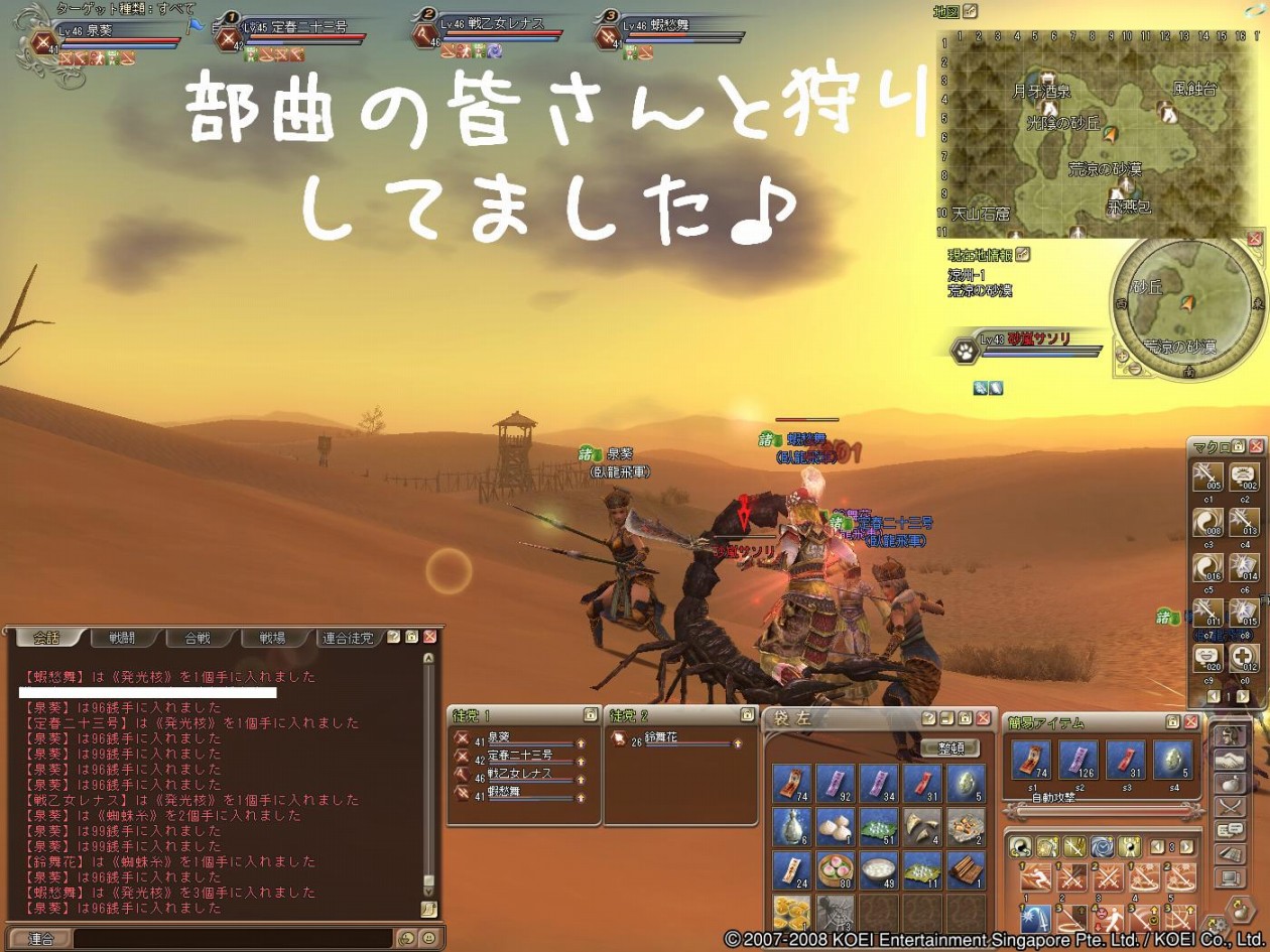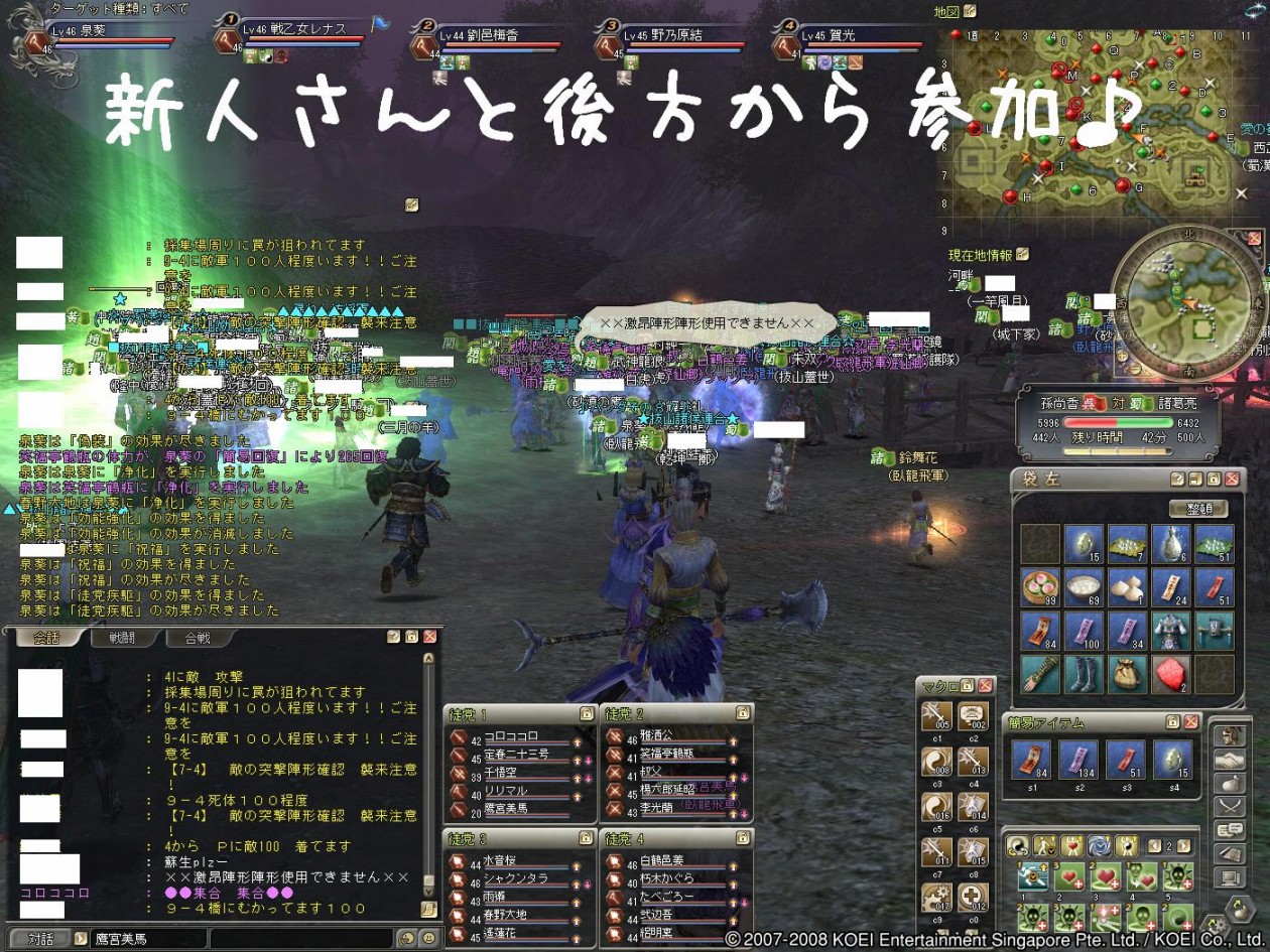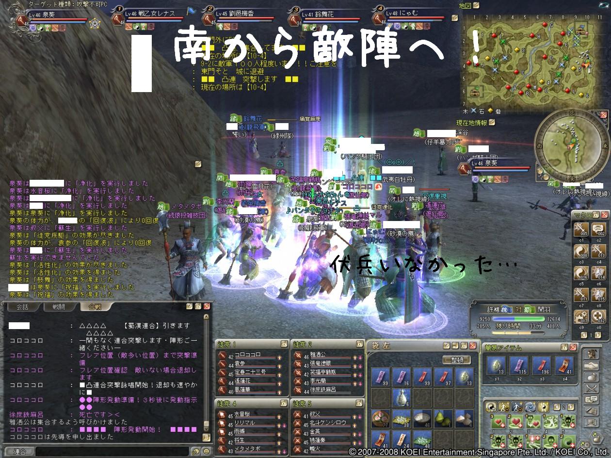こんにちわぁ~ またやることが増えて、とりあえず部曲砦を楽しみたい葵です♪ 第一節の合戦激闘録もリセットされて、葵の周りでも今日から移籍する人がいますね~ ・所属勢力のNPC“募兵役”にて「勢力を抜ける」ことができるようになりました。 ※期間は三国制覇戦第二節開始までとなります。 公式:2008.09.25クライアントパッチ内容 〔Ver.1.035 → 1.036〕より 新たな国へ移籍する人は、蜀とはまた違う雰囲気でしょうけど”がんばってくださいね!” 逆に蜀へ移籍する人は、 ”ようこそいらっしゃいませぇ~!” 三国制覇第一節での蜀は、3位の最下位でした>< 第二節では1位を目指して、蜀の力になりたい人を大募集中でし! 今日の水鏡村は勧誘合戦なのかなぁ~・・・ 部曲砦の様子がわかったら、後でちょっと水鏡村も覗いてみよ~と思いまふ♪ 昨日の蜀は合戦日でした!合戦状況をどぞ^^ 1陣です。魏戦では最近、伏兵が多かったんですけど、昨日はあまり見かけませんでした・・・ 突撃でドコまで倒せるのか?ちょっと自分に挑戦してみた合戦参加でした^^;
