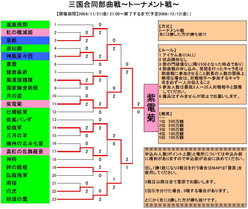 こんにちわぁ~ 最近は霊符作成が趣味の葵ですw そういえば年末年始って何かイベントあったよ~な?・・・ 餅でも配るんでしょ~か・・・Σ( ̄□ ̄; パンダその160からの続きになります 第2回黄河三国合同部曲戦~トーナメント戦~結果が出ましたぁ♪ 黄河は部曲戦が盛んで、部曲戦イベントもイロイロ開催されてまふ^^ 葵は丹キャラなので、参加するのを躊躇ってましたけど・・・機会があれば参加しよ~と思いま~す! それでは結果内容をどうぞ~♪ 3回戦・準決勝・決勝結果