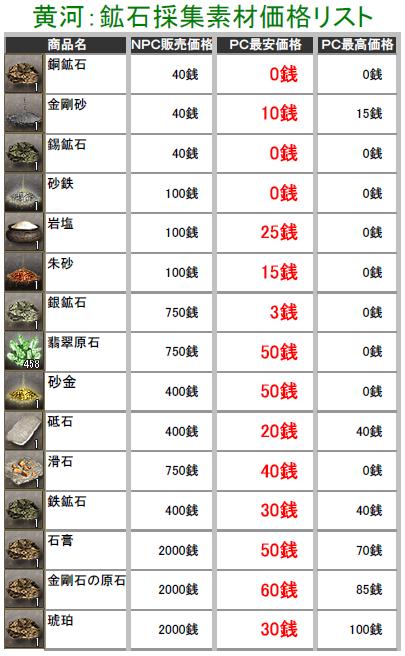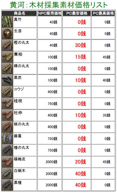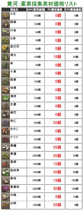 こんにちわぁ~ 最近は生産したアイテムの価格調査してます葵でし♪ 突然ですが、黄河蜀に所属している部曲を抜けることになりますた・・・ 部曲メンも独立して、新しい部曲を立ち上げたりとイロイロ考えているみたいなので 私も一から心機一転で、何か動こうと思い今回の決断をしますた・・・ 勢力移動するつもりはありませんので、蜀にはそのまま残りまふ♪ 一人で部曲を立ち上げる力も無いので、益州のどこかで野たれ死にする前に 他の部曲を探そうと考え中でし! ちなみに行先は決めてません^^; 今の部曲には大変お世話になったので、皆さんに感謝しています(T▽T)ダァ♪ 合戦やどこかで会いましたら、これからもヨロシクお願いしますね^^ 黄河の長安と涼州でちょこちょこと価格調査してみますた! 某なんとか倶楽部さんのパク・・お手本に、私も作成してみましたのでこれからも ちょっとづつ更新していきまふ^^; ※実際に販売している価格しか掲載してませんので、販売されていなかったモノについては 記載していません。 価格表は高レベルのアイテム記載をしていません! 初心者さん向けの価格表になりますので、上級アイテムを確認したい方は残念ながら 今回は掲載していませんのでご了承ください>< 掲載しているアイテムにはプレイヤーさんの採集・加工の手間や等級もありますので 一概に高い!安い!って判断にはなりませんけど参考までにどうぞ^^; (画像をクリックすると拡大されます) 黄河PC売りの販売価格表でし! まずは鉱石・木材・薬草採集のアイテム価格表で~す♪