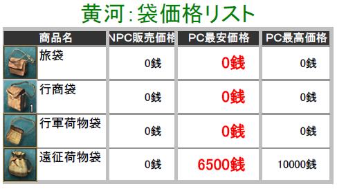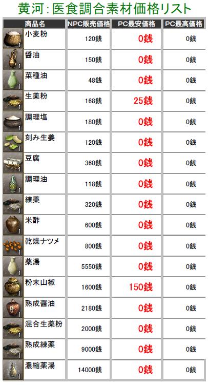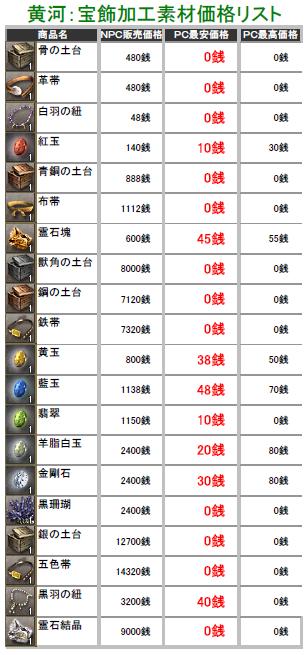 こんにちわぁ~ ネタが無いときは使いまわし技で連載しちゃいます葵です>< ネタ的に失敗かな?と昨日の記事に書きましたけど、中途半端も気になるので続きを掲載しまふ^^; その前に、レッドクリフのメルマガ号外が届いてましたのでお知らせを一つ^^b 大ヒット緊急企画! テレ朝日の「シネマエキスプレス」内でスペシャルプレビュー放送決定! ■第1弾:12月19日(金)27:00 趙雲の最大の見せ場。「三国志」でも有名なエピソードである 長坂の戦いを、たっぷりお見せします! ■第2弾:12月21日(日)26:45 孔明の奇策が炸裂!あの「九官八卦の戦い」が、大迫力の 映像で、現代によみがえる名シーンを放映! 「レッドクリフ」を劇場でもう観た方も、まだ観てない方も 名シーンを見られる貴重なチャンスです!お見逃しなく!! 今日の朝4:55頃に、フジの「めざにゅ~」でも特集してたよ~ですが、寝てたので見てません^^; 以上、レッドクリフのお知らせでした(’’ それでは昨日に引き続き、黄河のPC販売価格表をどぞ♪ ※前回の記事にも書きましたが、用法・容量を正しくお使い下さいw ※実際に販売している価格しか掲載してませんので、販売されていなかったモノについては 記載していません。 価格表は高レベルのアイテム記載をしていません! 初心者さん向けの価格表になりますので、上級アイテムを確認したい方は残念ながら 今回は掲載していませんのでご了承ください>< 掲載しているアイテムにはプレイヤーさんの採集・加工の手間や等級もありますので 一概に高い!安い!って判断にはなりませんけど参考までにどうぞ^^; (画像をクリックすると拡大されます) まずは宝飾加工・医食調剤加工・袋の価格表で~す♪「