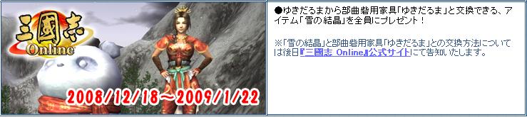 こんにちわぁ~ 採集と生産ばかりで、戦闘レベルが止まってる葵です・・・orz 次のイベントはいつだろ?って公式見ていたら、 コーエーオンラインゲームの『ゆきまつり合同イベント』告知がありますた・・・ いろんな意見が出そ~なイベントですけど(; ̄ー ̄A アセアセ・・・ 『三国志オンライン』は何するのか見ていると、 部曲砦用の家具で「ゆきだるま」がもらえるらし~ですw 画像にあるパンダっぽい「ゆきだるま」ならカワイイかも♪ 2秒だけ惹かれた葵ですた。 夏でも砦前に「ゆきだるま」置きっ放しなら違和感ありそうですけど・・・ え~、他にも内容詳細がありましたので画像クリックでご覧ください^^; 最近、リンク先をちょこちょこ訪問していた時の話^^b 映画「レッドクリフ」ブログクチコミ情報サイト(タイトル長い・・・)から、このブログが掲載されると メールでお知らせが来るようになってまふ♪ 掲載される基準がよくわからないんですけど、レッドクリフネタを書くと必ず掲載はされるよ~でし^^ 今までは合戦ネタって掲載されなかった事が多かったんですけど、サイト覗いてみたら ビックリしますた><