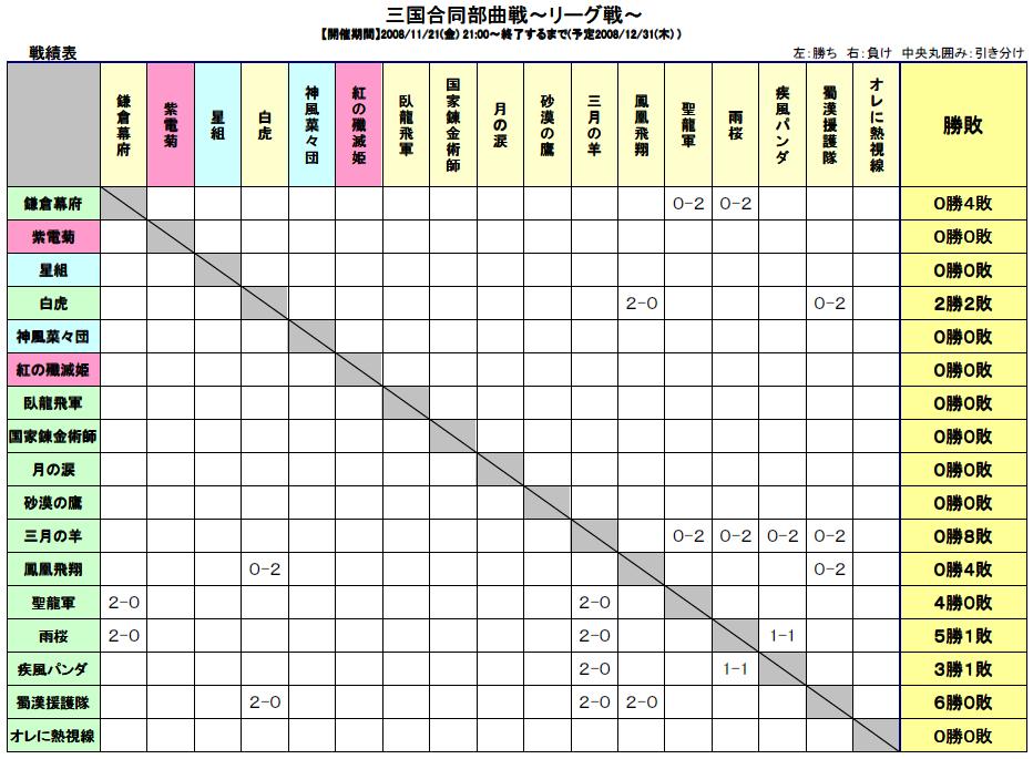 こんにちわぁ~ 相変わらず採集のレベルが上がらない葵です・・・ 黄河三国合同部曲戦~トーナメント戦~と平行して~リーグ戦~が始まってま~す! 前回のトーナメント同様に途中経過をお知らせしまふ^^ リーグ戦結果